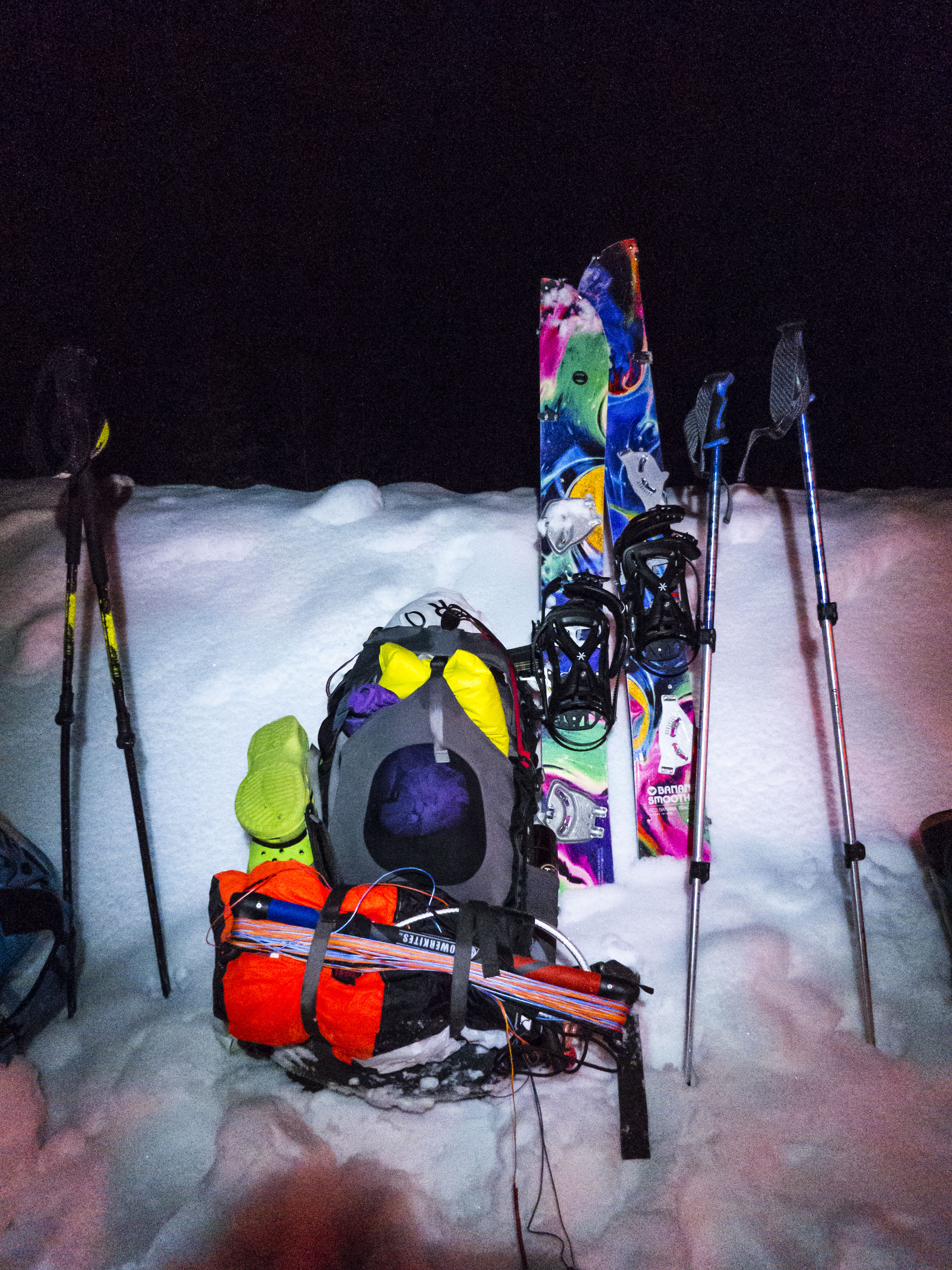 Afterski-juomien jälkeen oli taas edessä visainen kysymys: mihin seuraavaksi? Pääsiäistä oli jäljellä enää muutama päivä, ja tiistaina pitäisi olla jo kotona Helsingissä. Päädyimme ajamaan 500 kilometriä takaisin Pallakselle. Saimme auton parkkiin puolenyön maissa. Rämmimme infrapunavalot päällä lumihangessa ikuisuudelta tuntuvan ajan etsiessämme laavua. Selässä oli reilusti yli 30 kiloa eli puolet painostani. Siitä huolimatta nautin joka hetkestä, pimeä, talvinen metsä oli äänetön, yhtäaikaa pelottava ja rauhoittava. Eikä kovin moni asia voita sitä tunnetta, kun keskellä pimeää löytää kauan etsimälleen leiripaikalle. Saa pudottaa rinkan maahan, ottaa jalat pois monoista tai vaelluskengistä ja kömpiä lämpimään makuupussiin tietäen että aamulla herätessä silmien edessä on taas uusi maisema.