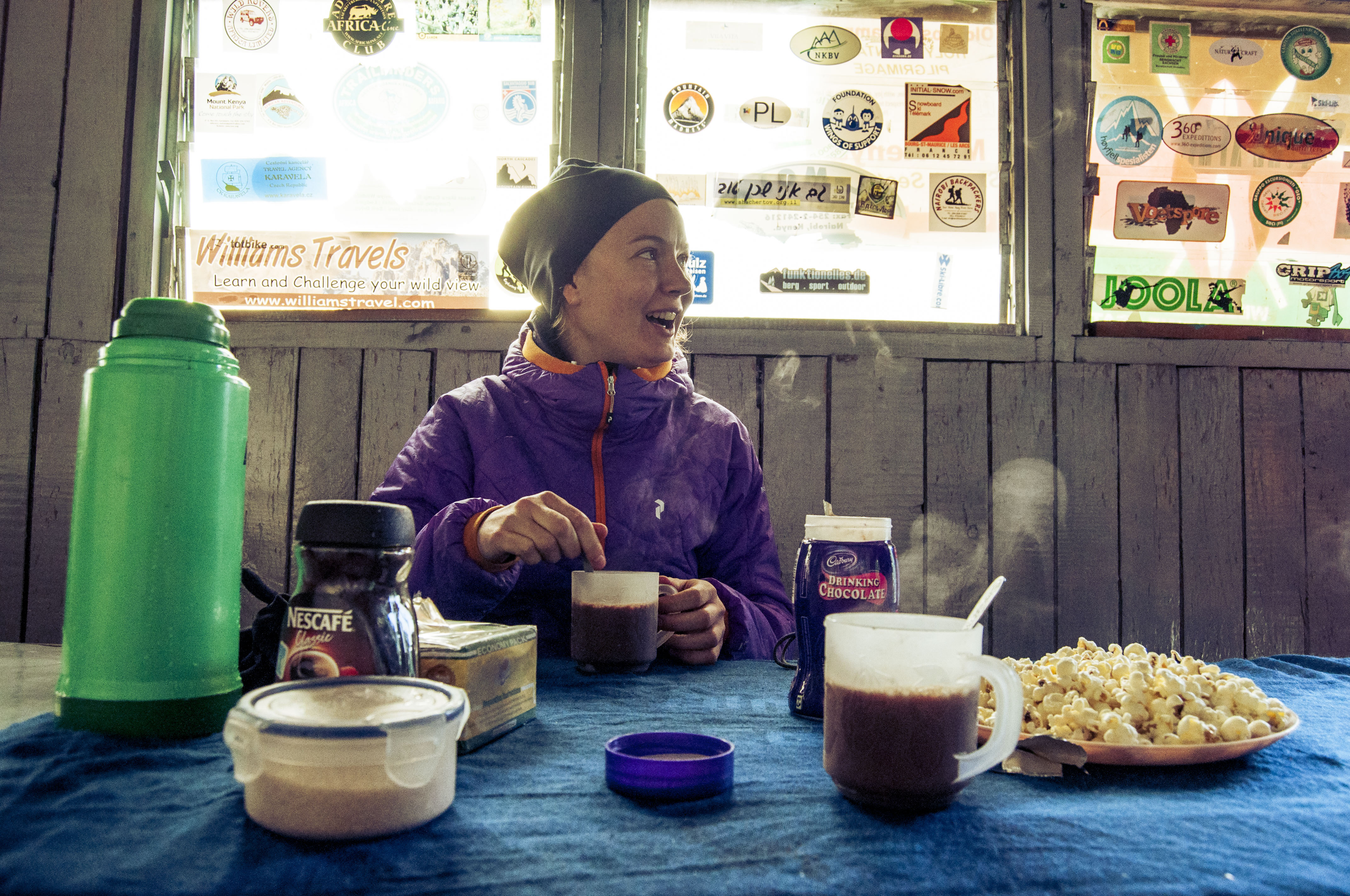 Pian edessämme näkyivät lumiset huiput, enkä voinut käsittää, että olin edelleen Afrikassa. Korkeusero jomotti päässä, ja ajatukset ohenivat. Leiripaikka, Mt Kenian “perusleiri”, sijaitsi 4200 metrissä. Olin ensimmäistä kertaa elämässäni niin korkealla. Olin saanut lääkäriltä nestettä poistavia tabletteja, jotka kuulemma auttoivat vuoristotautiin. Popsin niitä alusta saakka, mutta siitä huolimatta tunsin itseni humalaiseksi. Liikkeet olivat raskaampia, ajatuksia oli hankala käsitellä, ja suusta pääsi ulos mitä sattuu. Tavarat eivät pysyneet sitäkään vähää järjestyksessä mitä yleensä. Tämä oli kuitenkin onneksi kevyttä verrattuna matkaseuraani, joka tärisi kuin horkassa ja kärsi kovista päänsäryistä. Autiotuvissa reitin varrella ei ollut lämmitystä ja lämpötila laski yöllä kaksinumeroisiin pakkaslukemiin. Naapurihuoneessa makasi nainen, joka ei päässyt kunnolla ylös sängystä niiden kahden päivän aikana, jotka vietimme perusleirissä.
