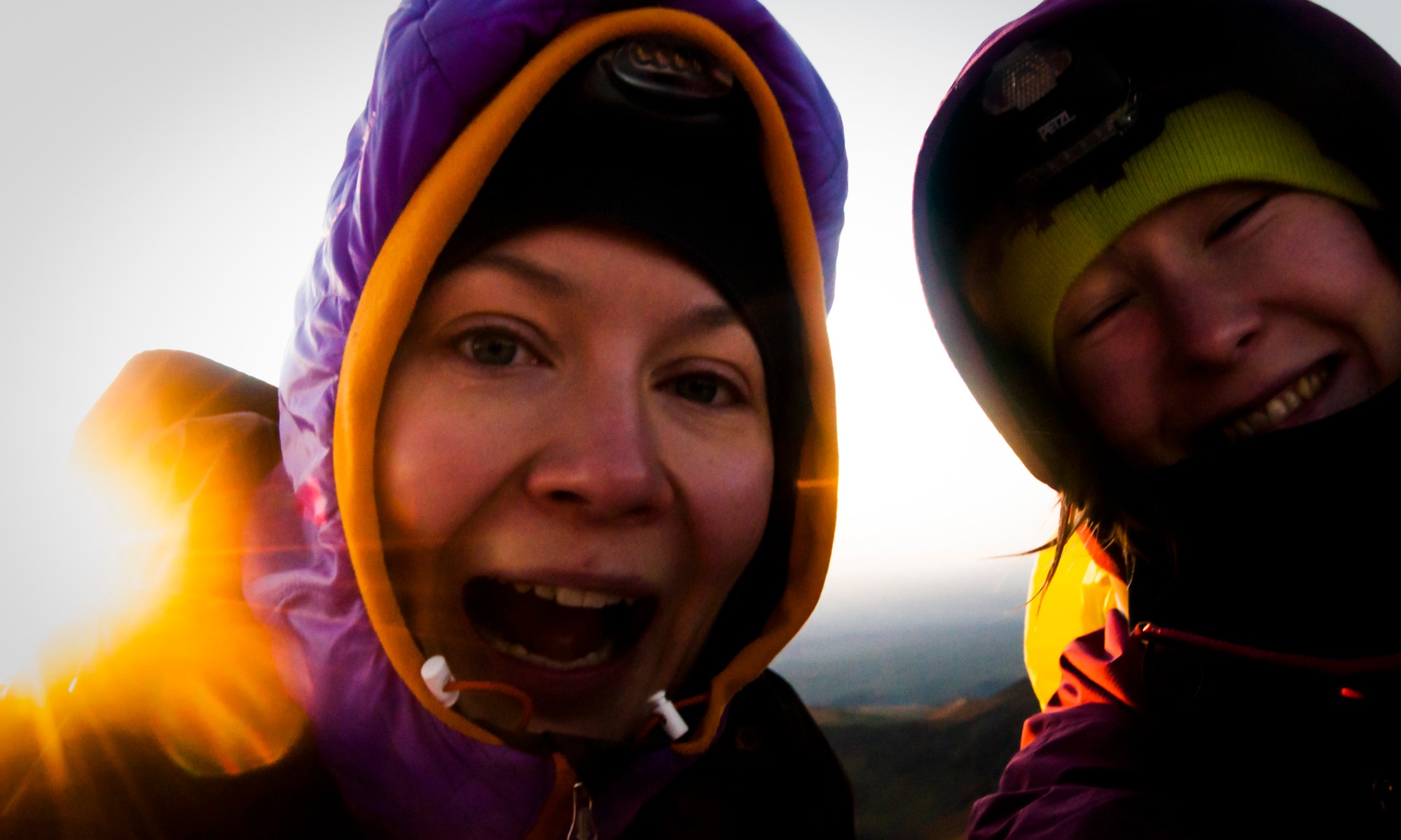 Heräsimme kahdelta ja olimme onneksemme niin tolpillamme, että lähteminen ylös oli järkevää. Kokoonnuimme ulkona otsalamppujen valossa ja lähdimme kiipeämään kohti huippua. Pakkasta oli reilusti, jokainen hengenveto tuntui keuhkonpohjissa ja askeleet olivat kuin hidastetusta filmistä. Lumiraja tuli vastaan.