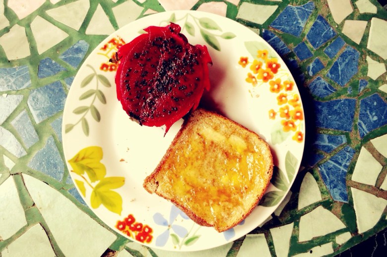 Välipalan aika. Toasteja ja dragonfruitin puolikas. Mikä se muuten on suomeksi? Lohikäärmehedelmä?