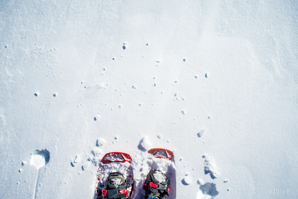 Tässä puolestaan ei. Yllättäen ylempänä oli 10-15 senttiä pehmeää, vain vähäsen pakkautunutta lunta. Olisiko pitänyt lähteä suksilla? Ei sentään, nämä TSL:n Symbioz-lumikengät olivat täysin oikea valinta päivän keliin. Ne ovat taipuisat, kevyet ja ketterät epätasaisessa maastossa. Eräs mies suksilla kääntyi ympäri, kun sukset eivät enää pitäneet ylöspäin ja monot upottivat. Hän katseli pitkään minua kun laskeuduin alaspäin, ja kohdalle päästessäni totesi: ”Sulla on oikeat varusteet tähän hommaan.”