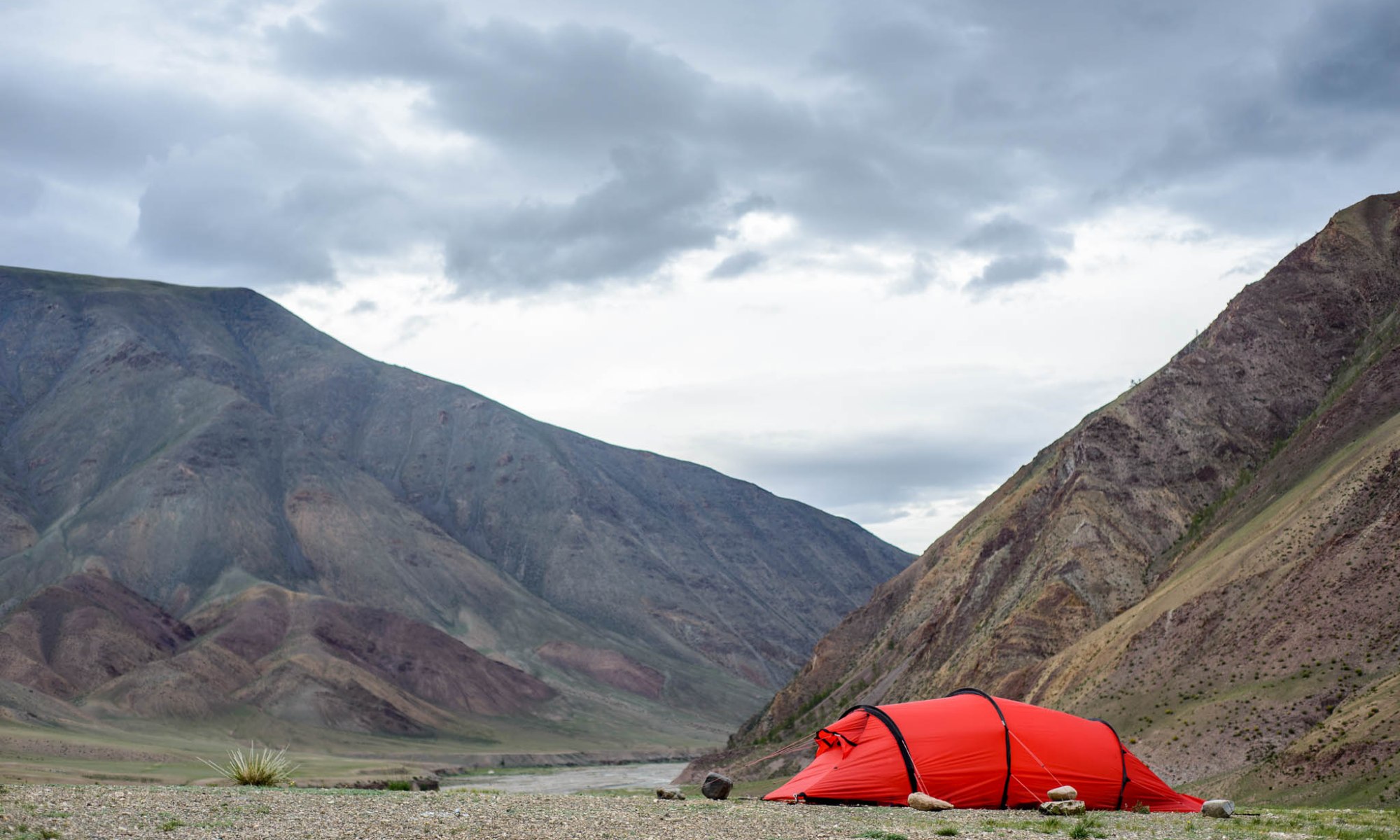 Aloitimme vaelluksen kohti Khotgoria (paikalliset ääntävät sen ”hothor”). Oli jo iltapäivä, joten laitoimme teltan noin seitsemän kilometrin päähän suolajärvestä.