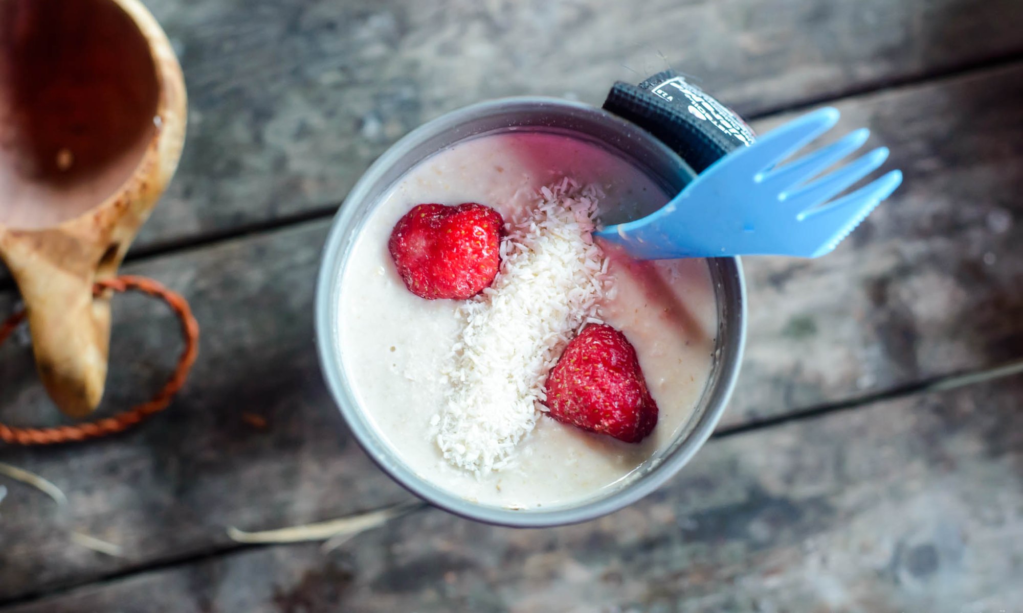 Mini glamping -menu piti sisällään mansikoita ja kookoshiutaleita aamupuuroon. Kiitos Heli! Minä olin myös sekoittanut omiin puurohiutaleihini hieman suklaanmakuista proteiinijauhetta jo kotona, joten tämä retkipuuro maistui parhaimmilta naismuistiin.