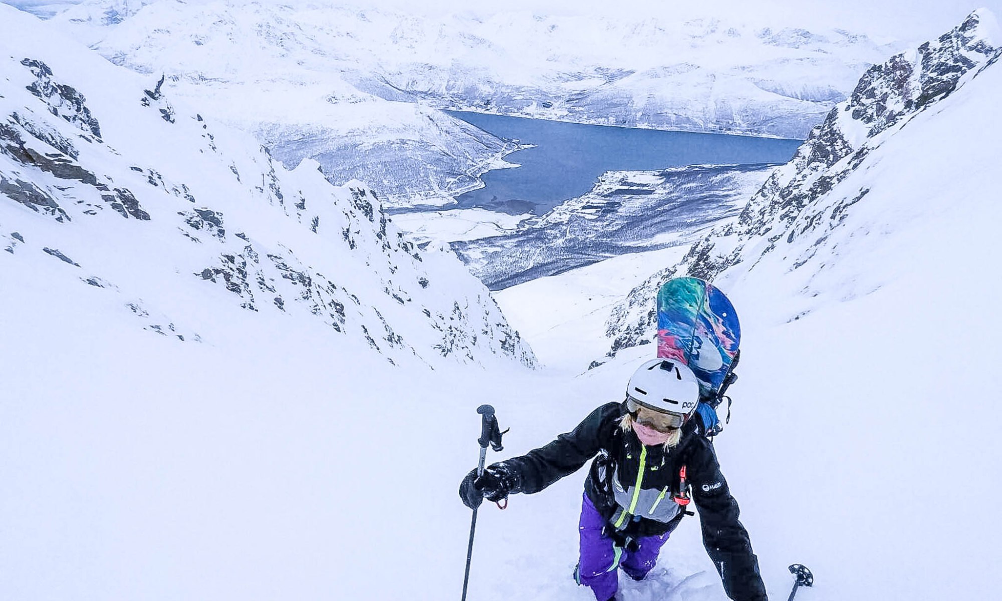 Olen aina pitänyt skinnaamista vahvuutenani vuorilla liikkuessa. Mutta mitä ihmettä – heti ensimmäisinä päivinä Lyngenissä huomasin, että splitti ei luista ylämäkeen normaaliin tapaan. Olin monena päivänä jo lähestymisen jälkeen niin piipussa, että en tiennyt itkeäkö vaiko nauraa. Mietin, että kääntyisin ympäri ennen kuin varsinainen nousu oli ehtinyt alkaa.