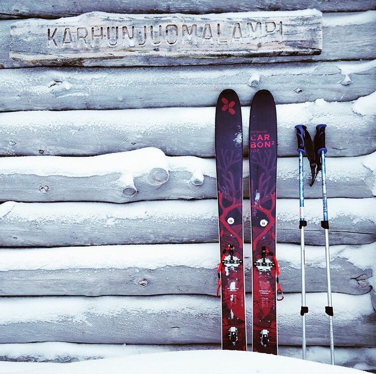– Extrem Opinion Carbon 108cm (nämäkin miesten!) tellu- ja alppisiteillä (blogiyhteistyö) – kevyet ja mukavat laskea.