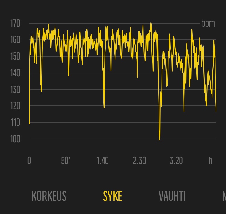Alusta aina maratonin kääntöpaikalle asti sykkeeni oli käytännössä koko ajan vähintään 90% tasolla, riippumatta siitä oliko maasto tasaista, ala- vai ylämäkeä. Se oli varmasti monen asian summa; aikainen aamu, huonot yöunet parina aiempana yönä, kiireiset työpäivät sekä muut henkilökohtaiseen terveyteen liittyvät seikat. Pääni kiehui, mutta käsivarsia paleli. Lämmönsäätelystä ei ollut tietoakaan.