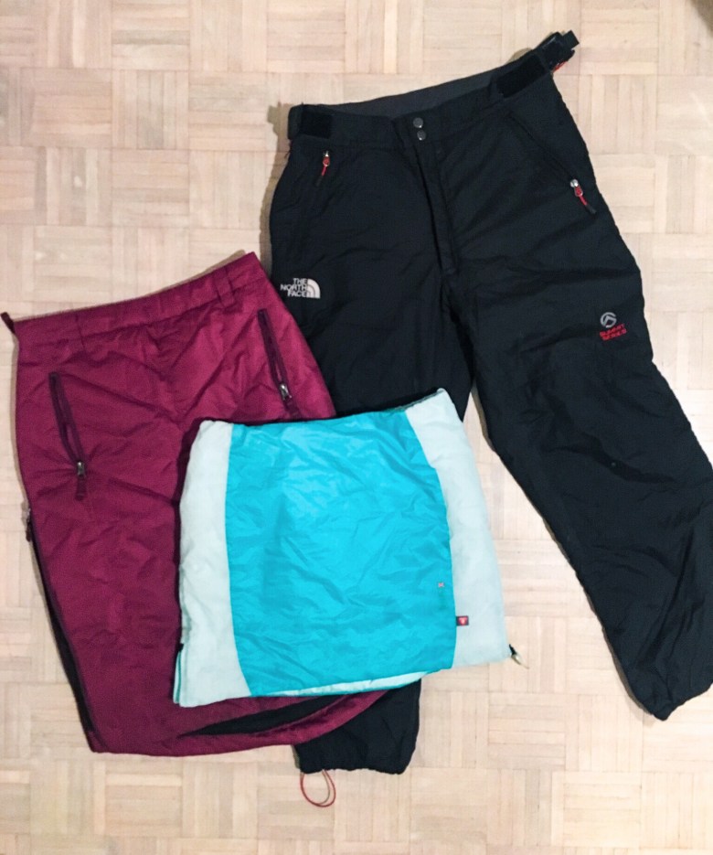 Vasemmalta: Skhoopin pitkä toppahame (yhteistyö), alimpana The North Facen toppahousut, joissa on täysimittaiset sivuvetskarit, jotta ne saa puettua helposti kenkien yli. Edessä ohuempi toppahame.