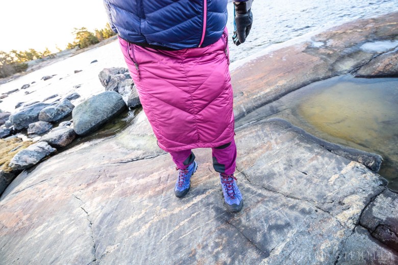 Näitä ilman en lähde talvisin mihinkään. Mulla on North Facen Primaloft -taukohousut, jotka on ostettu jo 10 vuotta sitten, mutta ovat edelleen kuranttia tavaraa. Jos retki on lyhyempi tai ei ole aivan kauhean kylmä, otan toppahousujen sijasta mukaan Skhoopin pitkän ja paksun toppahameen. Usein mulla on vielä kävelyä varten mukana lyhyt, kevyt toppahame joka pitää kankut lämpimänä liikkuessa.