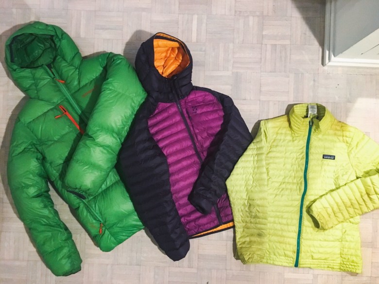 Vasemmalta viime kaudelle hankkimani Norronan Lyngen-takki (miesten), Haglöfsin Essens Mimic (yhteistyö), sekä Patagonian Down Sweater, jonka jäi hetken mielijohteesta käteen mayrhofenilaisesta alennusrekistä kolme vuotta sitten, sen jälkeen siitä on tullut yksi rakkaimmista varusteistani.