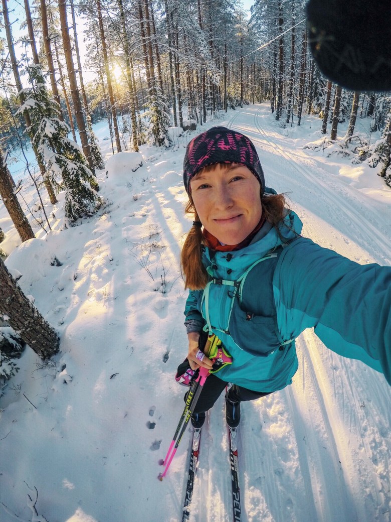 Varustevinkki: juomareppu toimii hyvin myös hiihdossa! Perinteiset hiihtovyölaukut painavat mulla alaselkään, mutta reppu skulaa hyvin.