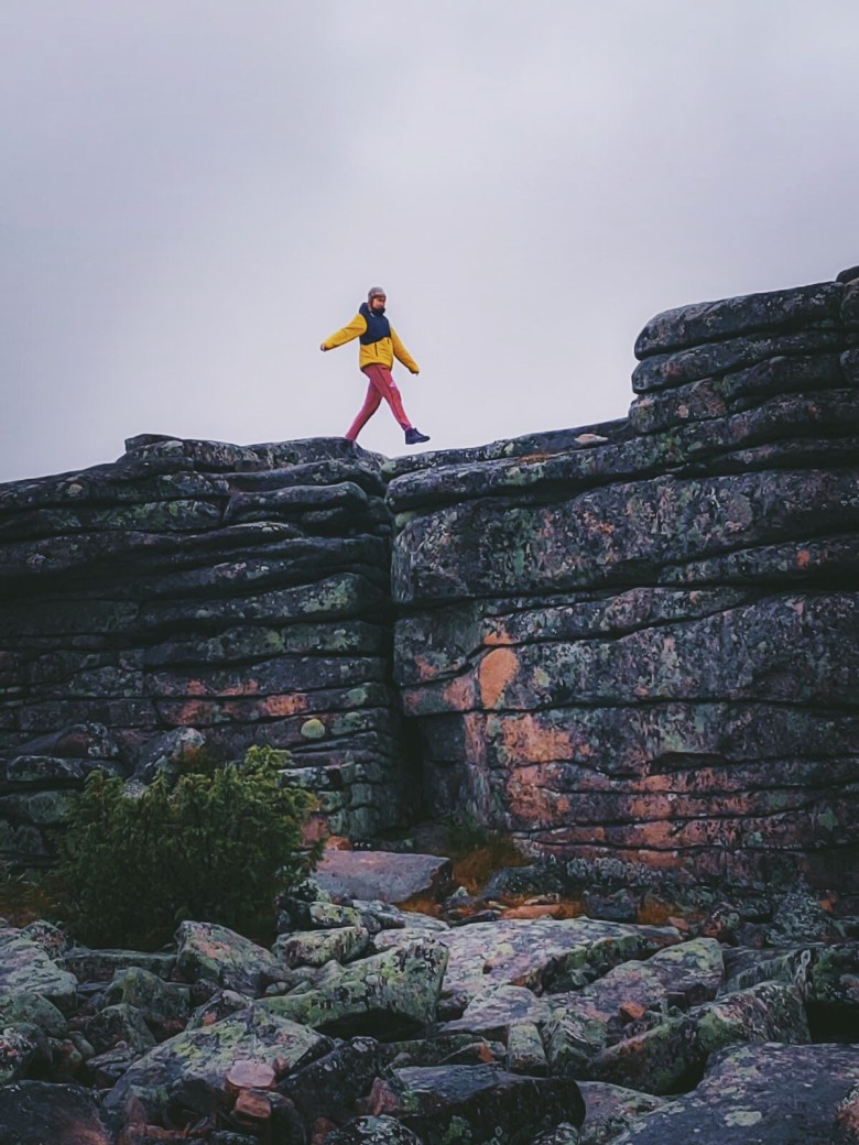 Kun lähdimme kiipeämään laavulta kohti Pyhä-Nattasen huippua, alkoi sataa. Pilvet roikkuivat matalalla, ja reitin valtavat kivenlohkareet olivat liukkaita.